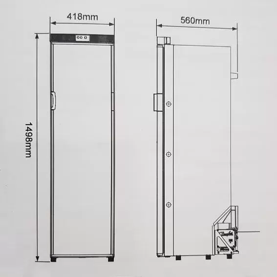 Abmessungen Tiefe inkl. Tür (Höhe x Breite x Tiefe): 1498 x 418 x 560 mm.