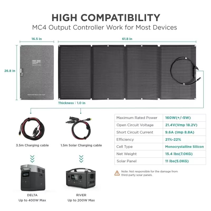 · Der universelle MC4-Stecker ist mit anderen Produkten auf dem Markt kompatibel und ermöglicht Ihnen, mehrere 160-W-EcoFlow-Solarmodule zusammen mit dem EcoFlow DELTA / RIVER für eine effizientere Solarstromerzeugung zu verbinden