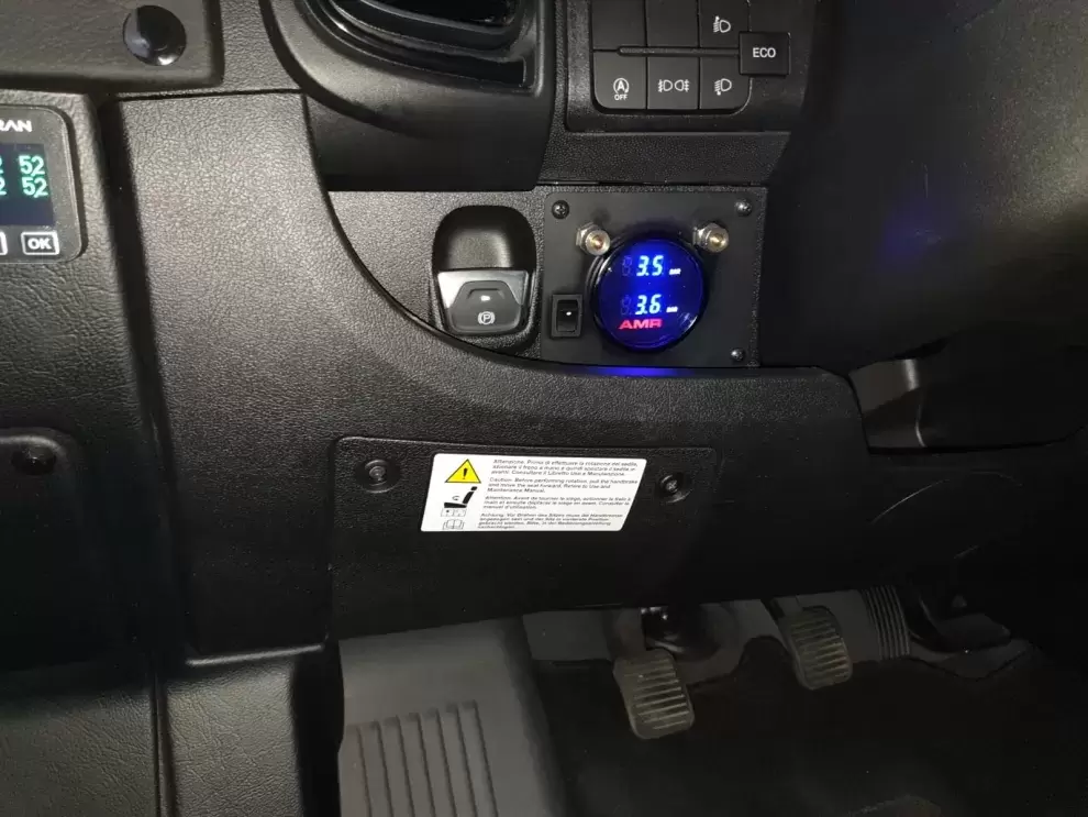 Bedienfeld bestehend aus einer Taste zum Starten des Kompressors und zwei analogen Manometern zur Anzeige jedes Drucks. Dieses System ermöglicht es Ihnen, das Wohnmobil oder den Camper auf einem Parkplatz auszurichten, indem Sie mehr Druck auf eine Kugel ausüben als auf die andere. Sobald wir unsere Reise fortsetzen, ist es nicht notwendig, die Luft aus dem anderen Luftballon abzulassen und den Druck erneut zu erhöhen, da das Ventilsystem die beiden auf den gleichen Druck bringt.