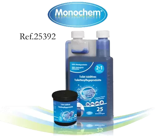 Fresh Blue ist eine formaldehydfreie Flüssigkeit, die Ihnen eine hervorragende Geruchskontrolle bietet und Ihren Badezimmertank sauber hält. Es hat einen sehr angenehmen Duft und eine dunkelblaue Farbe, die Hände oder Tanks nicht verschmutzt. Fresh Blue ist sicher für die Umwelt und für den Einsatz in tragbaren Toiletten. Es ist ein konzentriertes Produkt mit einem eingebauten Spender, der uns die exakte zu verwendende Dosis gibt, es wird in 1-Liter-Flaschen mit Dosierkammer angeboten.