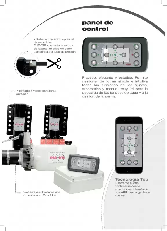Konzipiert und ausgeführt mit Sorgfalt bis ins kleinste Detail, um Qualität, Zuverlässigkeit, Komfort und Leistung an der Spitze der Kategorie zu bieten, bestehend aus einer elektrohydraulischen Steuereinheit mit 12 V oder 24 V und einer Handpumpe, die garantiert Auch die Beine im Fall entfernen von Stromausfall.