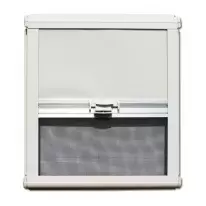 Kassettenset mit Moskitonetz und Jalousie, das an der Innenseite der Fenster von Wohnwagen oder Wohnmobilen angebracht werden kann, die keine haben, mit Führungen zum Verschieben der Planen mit Haken und widerstandsfähigen Verschlüssen.