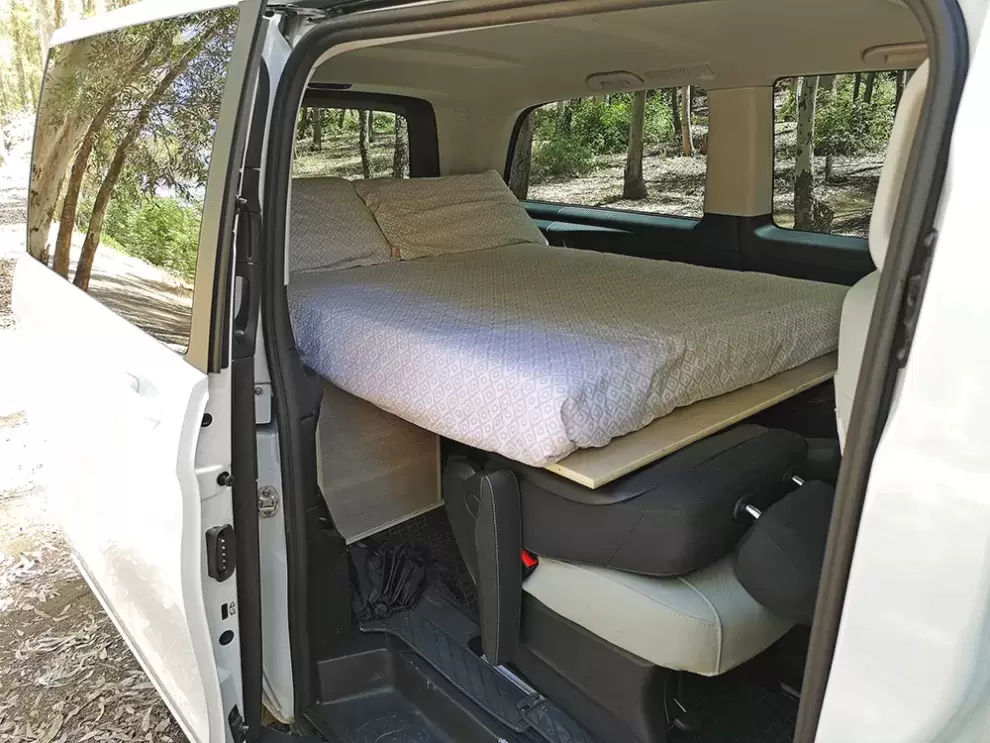 Nur die dritte Sitzreihe müsste aus dem Fahrzeug entfernt werden, sobald die zweite Sitzreihe umgeklappt ist, ruhen die Bettbretter auf den Rückenlehnen derselben Sitze, es enthält auch Aluminiumbeine, falls Sie diese Holzbasis verstärken möchten die sich an den Sitzlehnen abstützt.