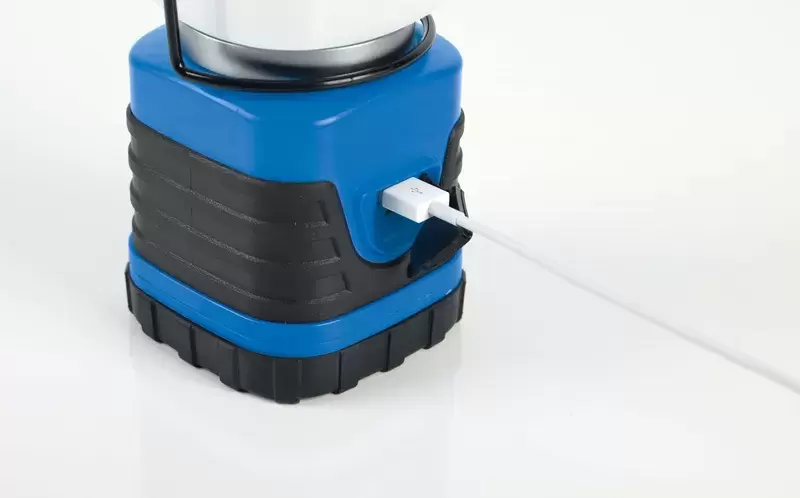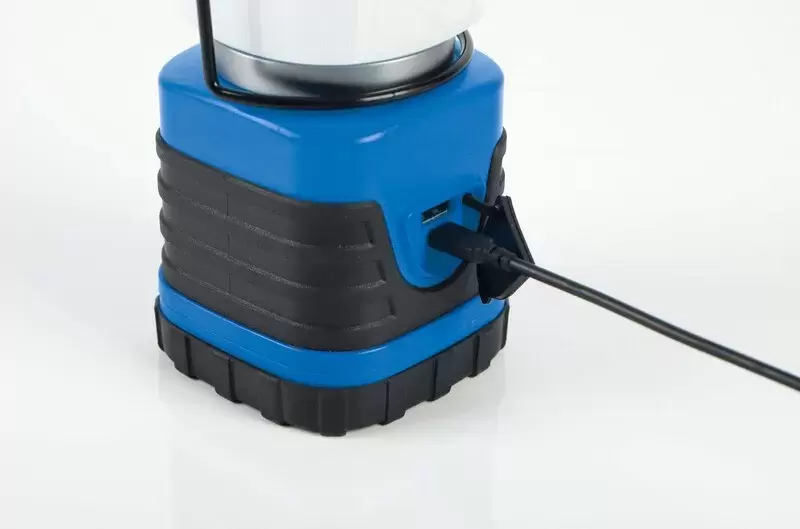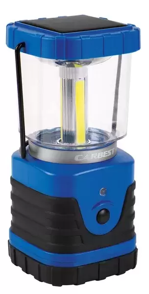 Batteriebetriebene LED-Zeltlaterne mit integriertem Solarpanel im Deckel.