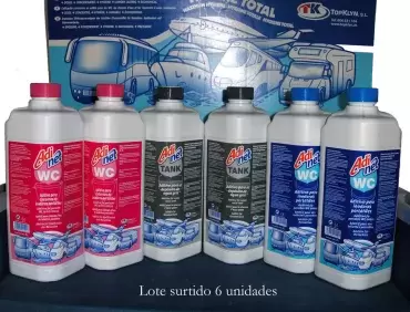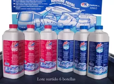 Sortiment bestehend aus 3 Flaschen à 2 l Produkt für die Toilette und 3 Flaschen à 2 l Produkt für den Grauwassertank.