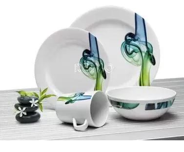 Schönes Melamingeschirr Lucca, 16 Teile für 4 Personen. Set aus 4 Tellern (Ø 25,3 cm), 4 Desserttellern (Ø 20,0 cm), 4 Suppentellern (Ø 15,2 cm) und 4 Kannen (0,3 Ltr. Vol.). 100 % Melamin, lebensmittelecht. Handwäsche bei niedriger Temperatur.