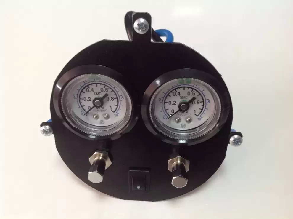 Bedienfeld bestehend aus einer Taste zum Starten des Kompressors, zwei analogen Manometern zur Anzeige jedes Drucks. Mit diesem System können Sie das Wohnmobil oder den Camper auf einem Parkplatz nivellieren und in einem Zylinder mehr Druck als in einem anderen haben, sobald wir folgen Bei unserem Marsch ist es nicht erforderlich, den anderen Ballon zu entleeren und erneut Druck auszuüben, sein Ventilsystem gleicht beide mit dem gleichen Druck aus.