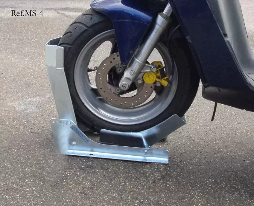 Ideale Halterung für die Montage in der Garage oder im Anhänger, mit einem Wippsystem, das das Rad in einer einzigen Bewegung erfasst, das Motorrad in einer vertikalen Position befestigt hält und es lösen kann, um die Befestigungsgurte bequem zu platzieren.