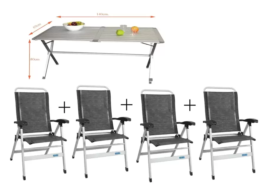Set aus abnehmbarem Aluminiumtisch (sehr kompakt nach dem Zerlegen und Zusammenklappen) und vier Stühlen mit hoher Rückenlehne und Aluminiumstruktur.