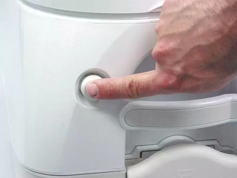Tragbare Toilette für Camping 972 Dometic. durch einfache Druckknopfbedienung, erhöhte Pumpeffizienz durch starke Druckspülung, bis zu 27 Spülungen mit einer Füllung, spritzfreies Entleeren, Überfüllsicherung bei kleinerem Frischwasservolumen / 8,7l und größerem Abwasservolumen 9,8l und besteht aus ABS und schöne glänzende Oberfläche.