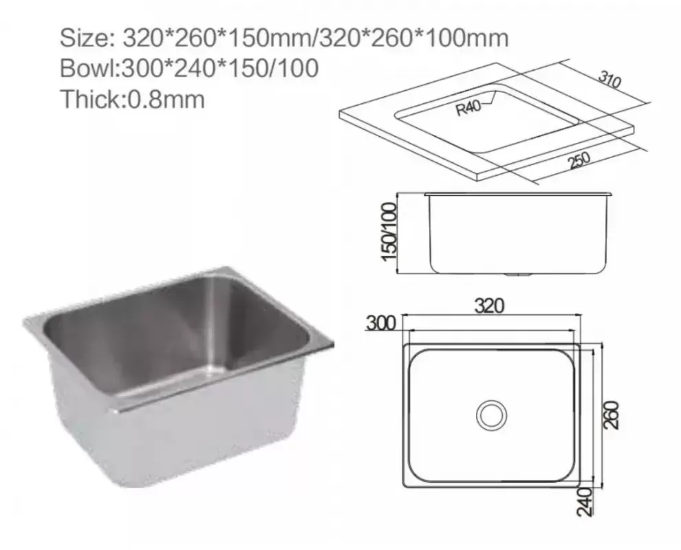 Rechteckige Edelstahlspüle 320x260 für Wohnwagen, Wohnmobile und Wohnmobile.