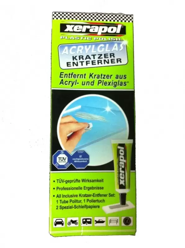 Repariert Kratzer an den Fenstern unseres Wohnwagens oder Wohnmobils. Es handelt sich um eine Politur, die Kratzer beseitigt oder mildert, die in Materialien vom Typ Methacrylat entstehen.