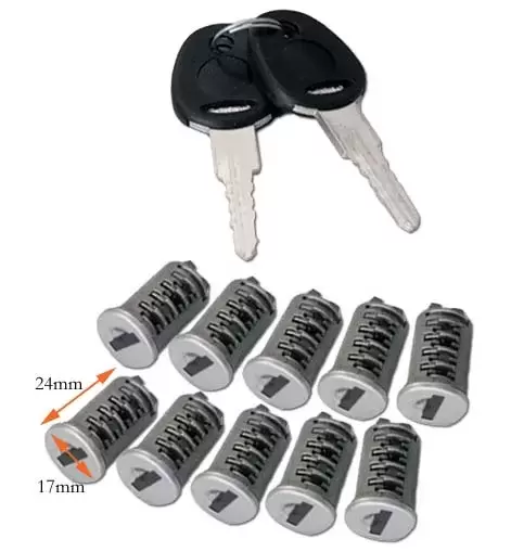 Set aus zehn Zylindern plus zwei Schlüsseln, um alle Truhen- und Garagentorschlösser mit einem einzigen Schlüssel zu ersetzen und zu vereinheitlichen.