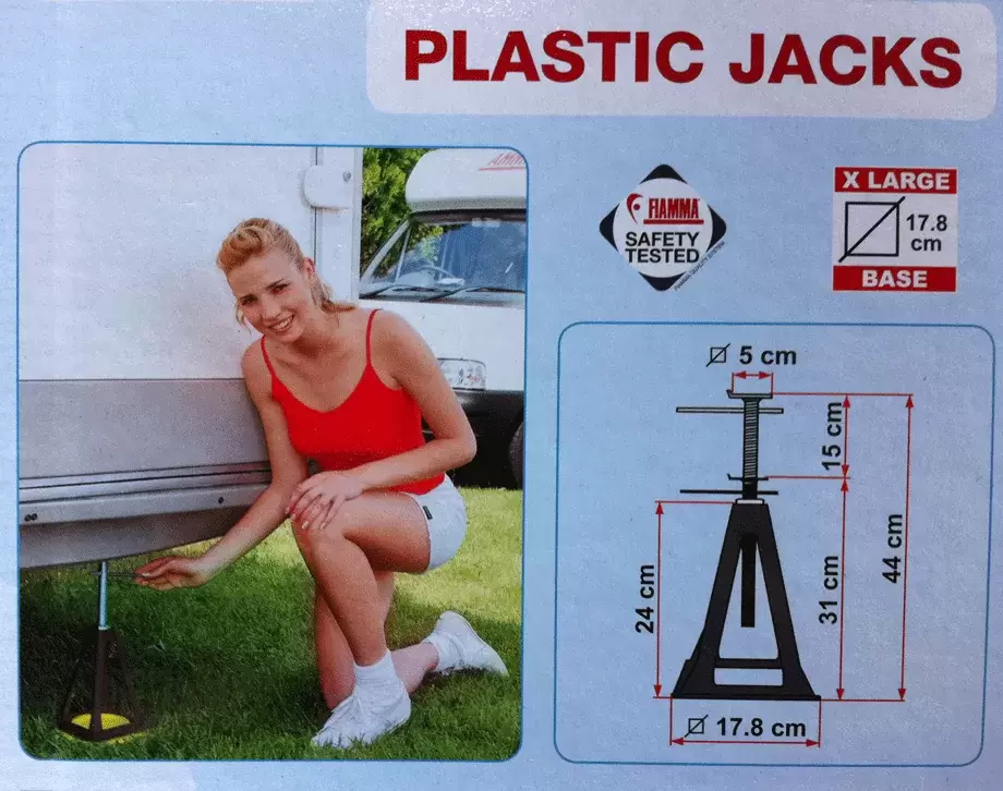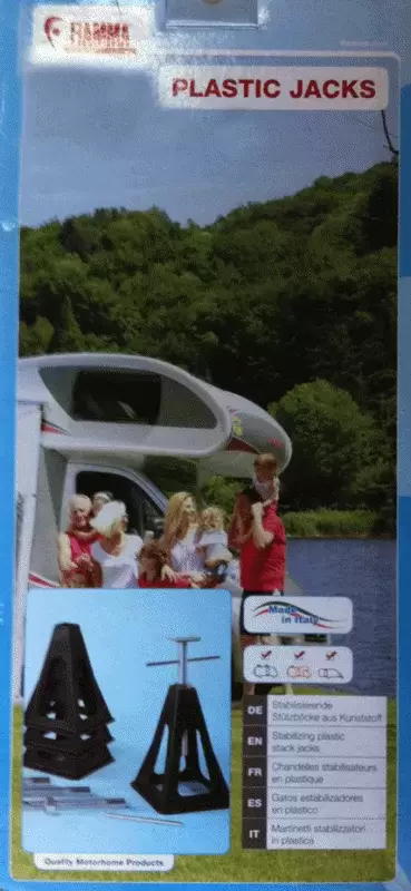 Aus schwarzem Kunststoff, geeignet sowohl zur Stabilisierung eines Wohnwagens als auch zur Entlastung der Reisemobilfederung.