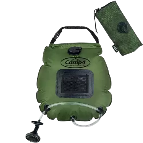 Tragbare 20-Liter-Solardusche für Wohnmobile und 4x4-Overland-Fahrzeuge.