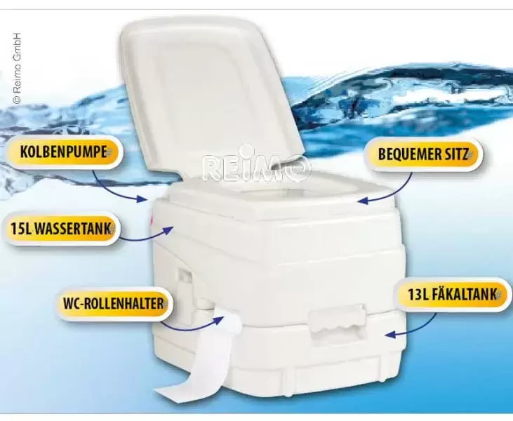 Perfekte Hygiene. Einfach zu bedienende, tragbare Chemietoiletten von höchster Qualität. Kompakte Größe, technisch ausgereift und leicht zu reinigen. Er besteht aus zwei Teilen, dem Oberteil mit Sitz, Deckel und Frischwassertank (15 Liter) und dem Unterteil mit Abwassertank (10 Liter) und Verschlussvorrichtung. Ober- und Unterteil sind durch einen Kunststoffverschluss verbunden. Das Unterteil ist mit einem robusten Griff versehen und lässt sich hermetisch verschließen, so dass Schmutzwasser bequem transportiert und entsorgt werden kann. Antibakterieller WC-Sitz verhindert die Bildung von Pilzen und Bakterien Solide und praktische Handpumpe mit großer Spülmenge von 15 Liter Wasser reicht für ca. 125 Spülungen Entlüftungsventil Alle Komponenten aus hochwertigem Designer-Kunststoff Sehr robuster hermetisch dichter Boden für den bequemen Transport zum Entleerungsort.
