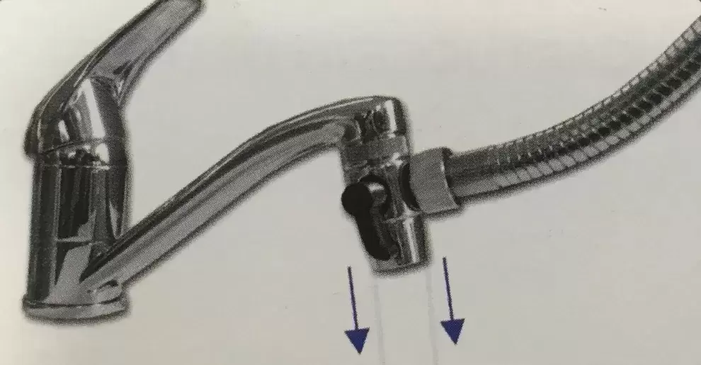 In der Normalstellung fließt das Wasser normal aus dem Strahlschalter und durch Drehen des Hebels wird der Wasserfluss vom Luftsprudler zur Handbrause umgeleitet.